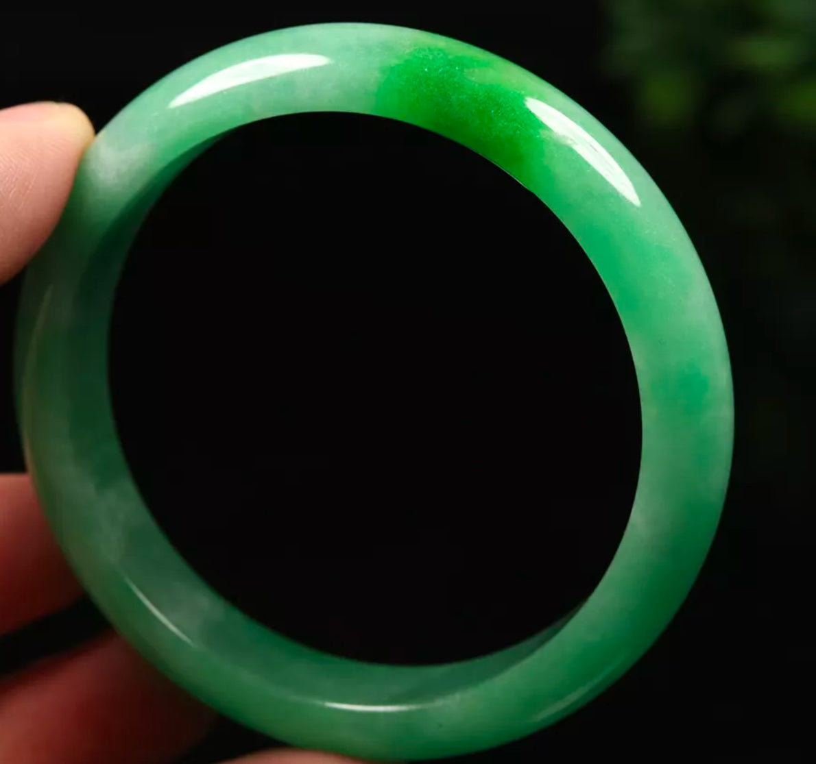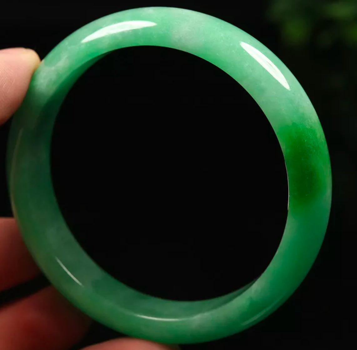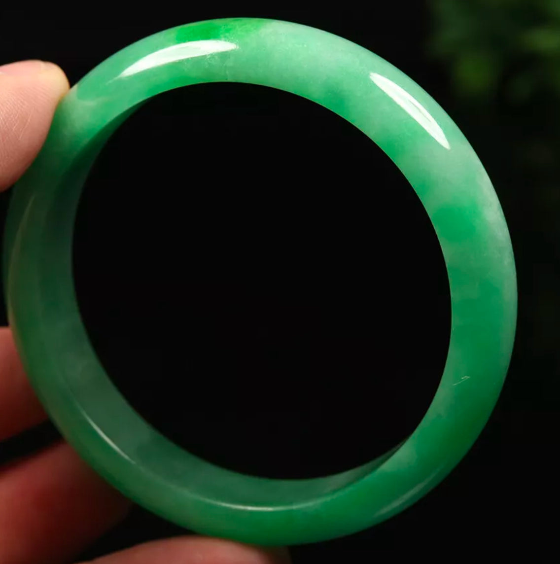 It is a green jade bangle, Regular standard square inner round outer, jade bangle.Emerald green jade shade, with a pop green jade, see images for more details.